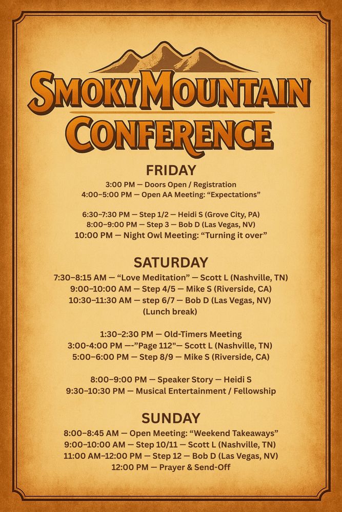 Join us for the Smoky Mountain Conference, a gathering of Alcoholics Anonymous in beautiful Pigeon Forge, TN at the Ramsey Hotel and Convention Center. January 31st to February 1st, 2026. Secure your spot today!